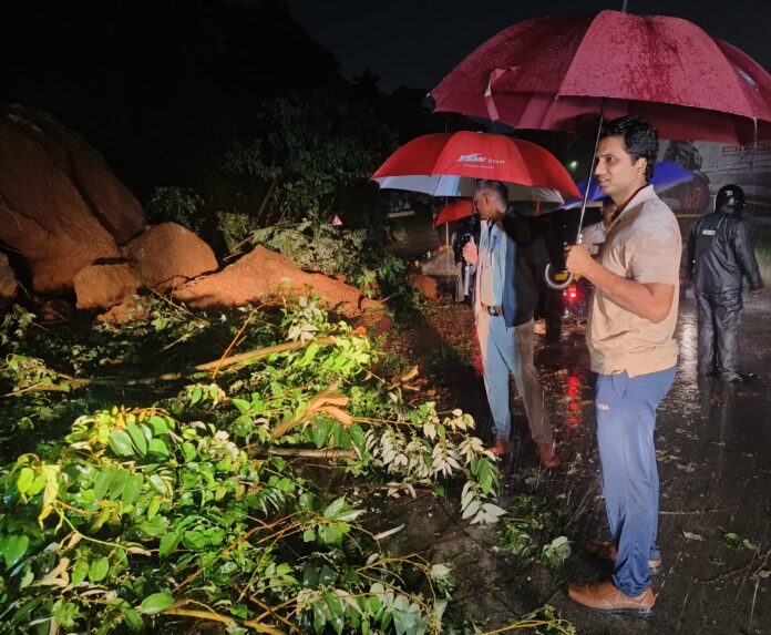 ನಗರದ ಸಕ್ಯೂ೯ಟ್ ಹೌಸ್ ಪಕ್ಕದ ಮುಖ್ಯರಸ್ತೆಯಲ್ಲಿ ಗುಡ್ಡ ಕುಸಿತ ಸಂಭವಿಸಿದ ಸ್ಥಳಕ್ಕೆ ಜಿಲ್ಲಾಧಿಕಾರಿಗಳು ಬುಧವಾರ ಮಧ್ಯರಾತ್ರಿ ಭೇಟಿ ನೀಡಿ ಪರಿಶೀಲಿಸಿದರು. ಬಳಿಕ ನಗರದ ವಿವಿಧ ಕಡೆ ಮಳೆಹಾನಿ ಮತ್ತು ನೀರು ನಿಂತ ಸ್ಥಳಗಳಿಗೆ ಭೇಟಿ ನೀಡಿದರು. ಪಂಪ್ವೆಲ್ ವೃತ್ತಕ್ಕೆ ಭೇಟಿ ನೀಡಿದ ಅವರು ನೀರು ನಿಂತು ಸಂಚಾರಕ್ಕೆ ಅಡಚಣೆಯಾಗುವುದನ್ನು ಗಮನಿಸಿ ಈ ಬಗ್ಗೆ ಕೂಡಲೇ ಕ್ರಮಕೈಗೊಳ್ಳಲು ನಗರಪಾಲಿಕೆಗೆ ಸೂಚಿಸಿದರು. ಕೊಟ್ಟಾರ, ಚೌಕಿ, ಕಾವೂರು ಮತ್ತಿತರ ಪ್ರದೇಶಗಳಿಗೆ ಭೇಟಿ ನೀಡಿ ಸಂತ್ರಸ್ತರಿಗೆ ಸಮಾಧಾನ ಸೂಚಿಸಿದರು.